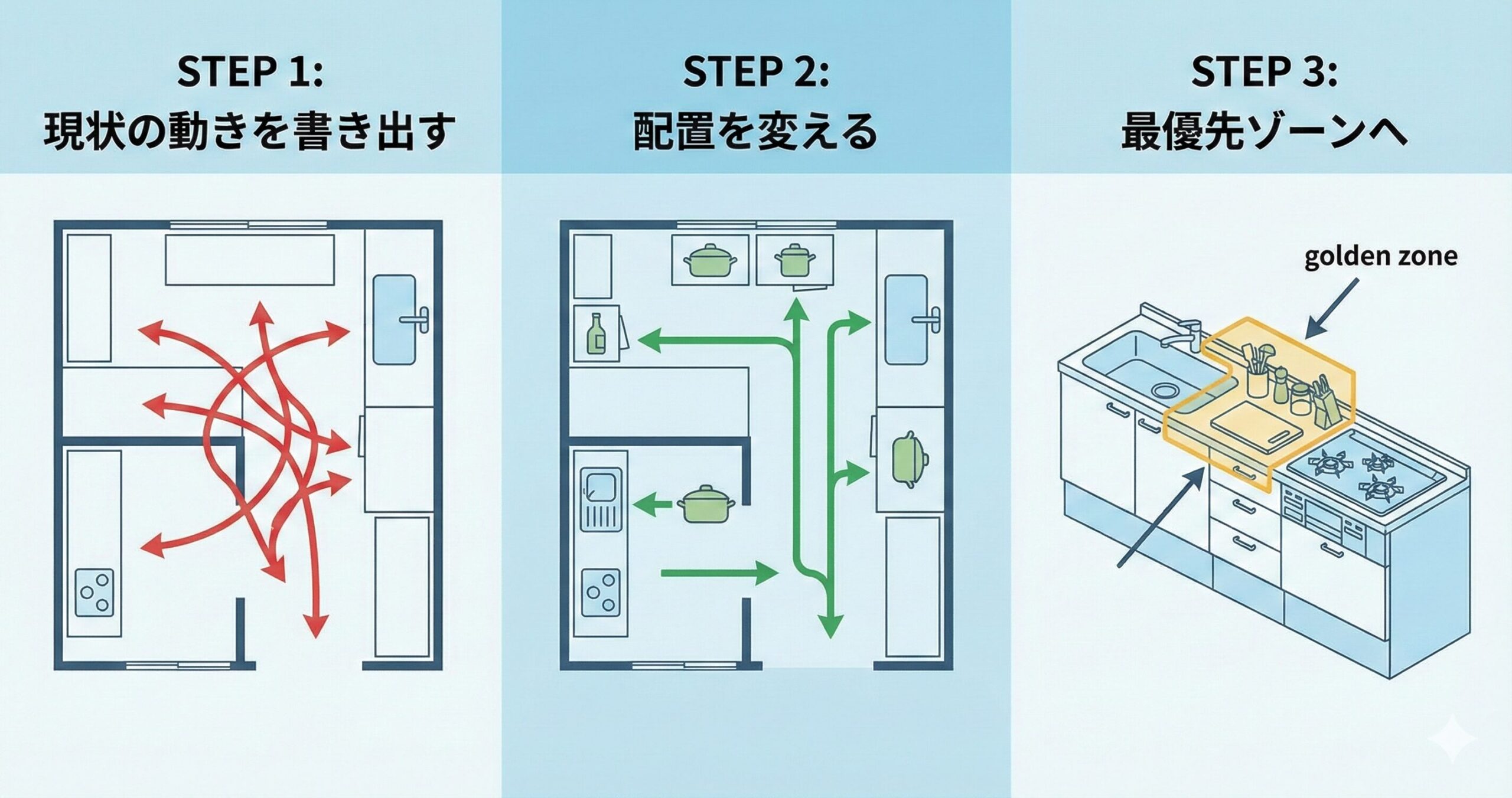 ここからは、実際にキッチンの動線を整えるための具体的なステップをご紹介します。この3つのステップを順番に実践することで、散らかりにくく、使いやすいキッチンに生まれ変わります。大掛かりなリフォームは不要で、今ある収納スペースと物の配置を見直すだけで実現できます。