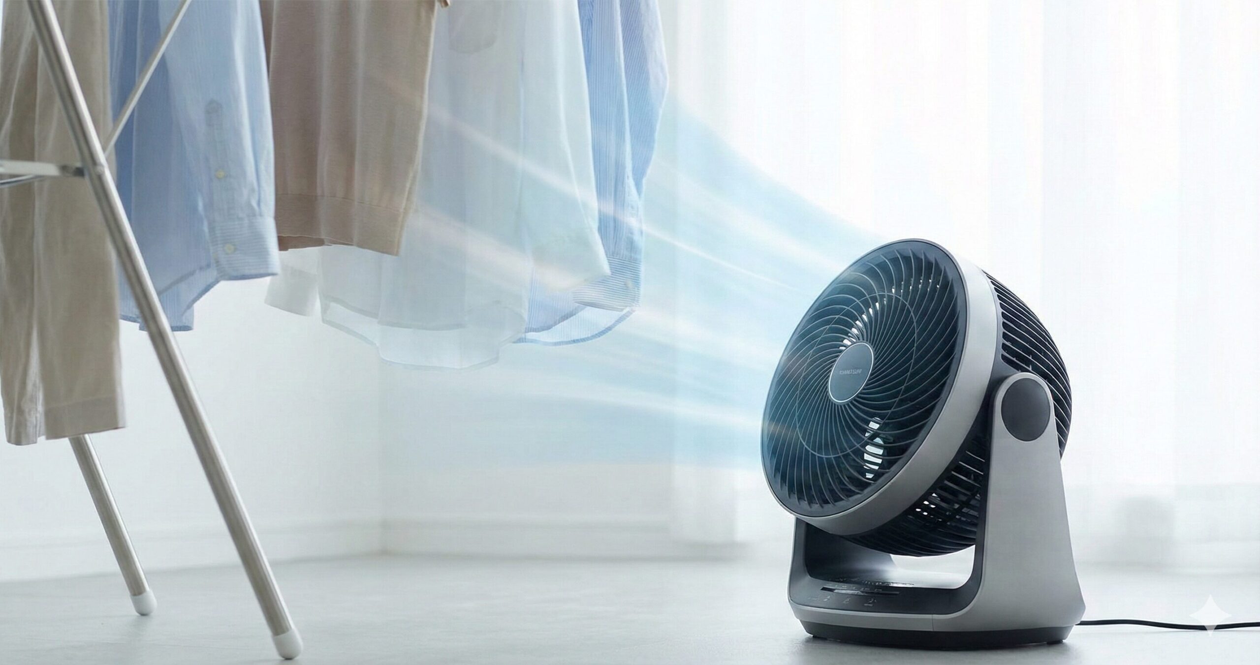 部屋干しで洗濯物を早く乾かすには、「風の流れ」を意識的に作ることが最も効果的です。ただ扇風機を回すだけでなく、風の向きや強さ、干す位置との関係を考えることで、乾燥効率は大きく変わります。ここでは、科学的に効果が証明されている風の流し方をご紹介します。