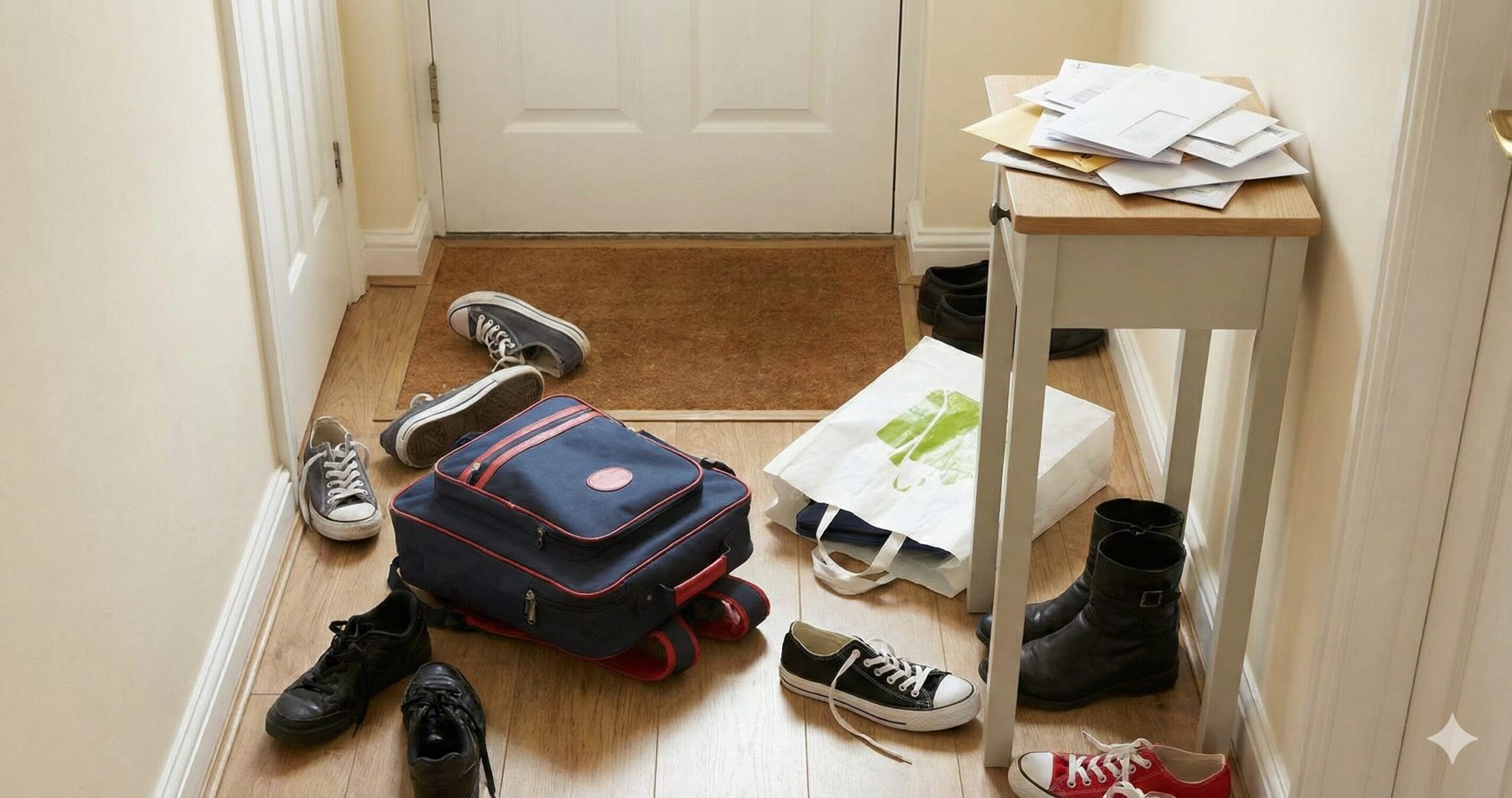 玄関が散らかる最大の原因は、家族全員が「とりあえずここに置いておこう」と適当に物を置いてしまうことです。帰宅した瞬間、靴を脱ぎ散らかし、バッグはその場に下ろし、上着は靴箱の上に放置——こうした行動が家族全員で行われると、あっという間に玄関は混沌とした状態になります。