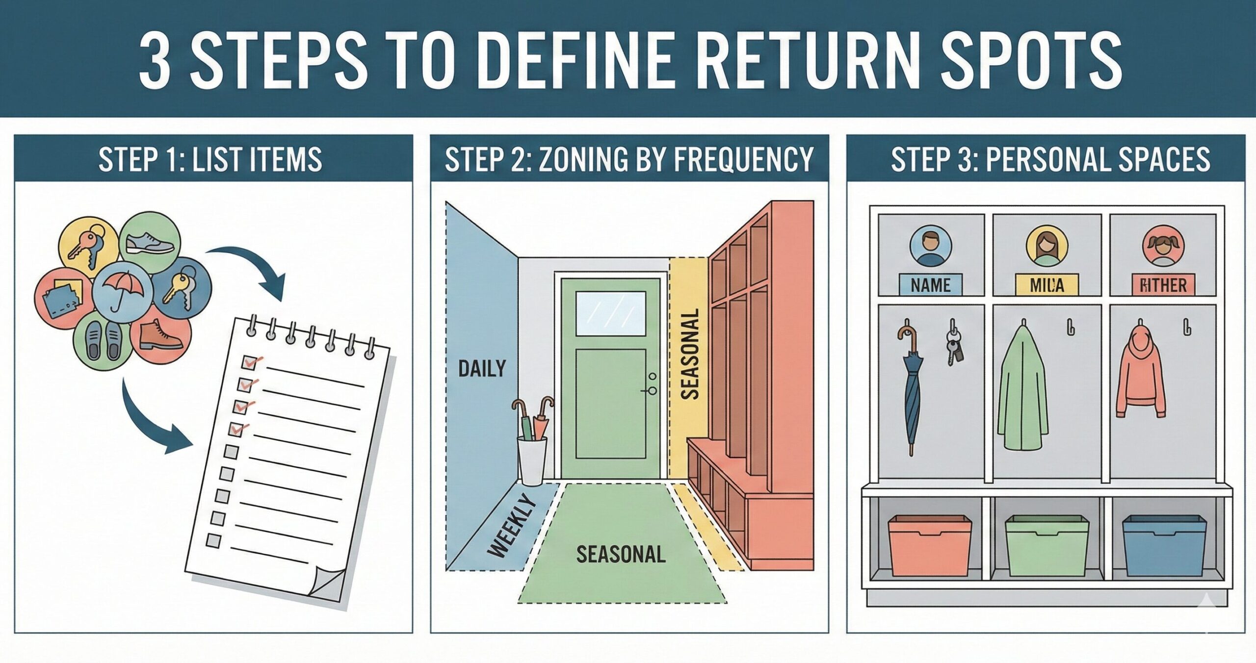 玄関のごちゃつきを防ぐためには、「戻す場所」を明確に決めることが最も効果的です。ただし、闇雲に収納を増やせば良いというわけではありません。大切なのは、家族の行動パターンに合わせた配置と、誰が見てもわかる明確なルールです。ここでは、実践的な3ステップで戻す場所を決める方法をご紹介します。