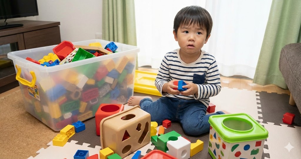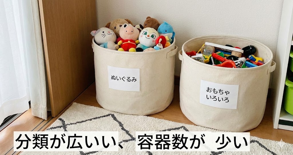 子どもが片付けを嫌がる最大の理由は、「選択肢が多すぎて迷う」ことです。大人は、おもちゃを細かく分類することが「整理された状態」だと考えがちです。ブロック、ミニカー、人形、ぬいぐるみ、パズル、お絵かきセット——それぞれに専用の箱や引き出しを用意し、「ブロックはこの箱、ミニカーはこの箱」と明確に分けます。しかし、この細かい分類は、子どもにとっては混乱の元なのです。