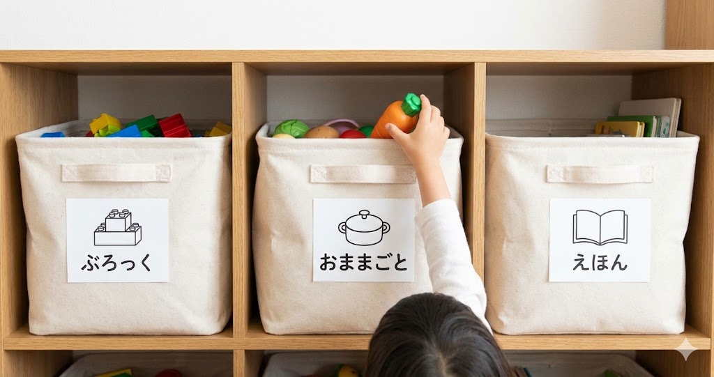 理想的な収納ボックスの数は、3〜5個程度です。例えば、「小さいおもちゃ」「大きいおもちゃ」「ごっこ遊びグッズ」の3つだけ——このシンプルさが、子どもの理解を助けます。ボックスにイラストや色分けをしておくと、さらに分かりやすくなります。「青い箱は小さいもの、赤い箱は大きいもの」——視覚的なヒントがあることで、文字が読めない子どもでも判断できます。
