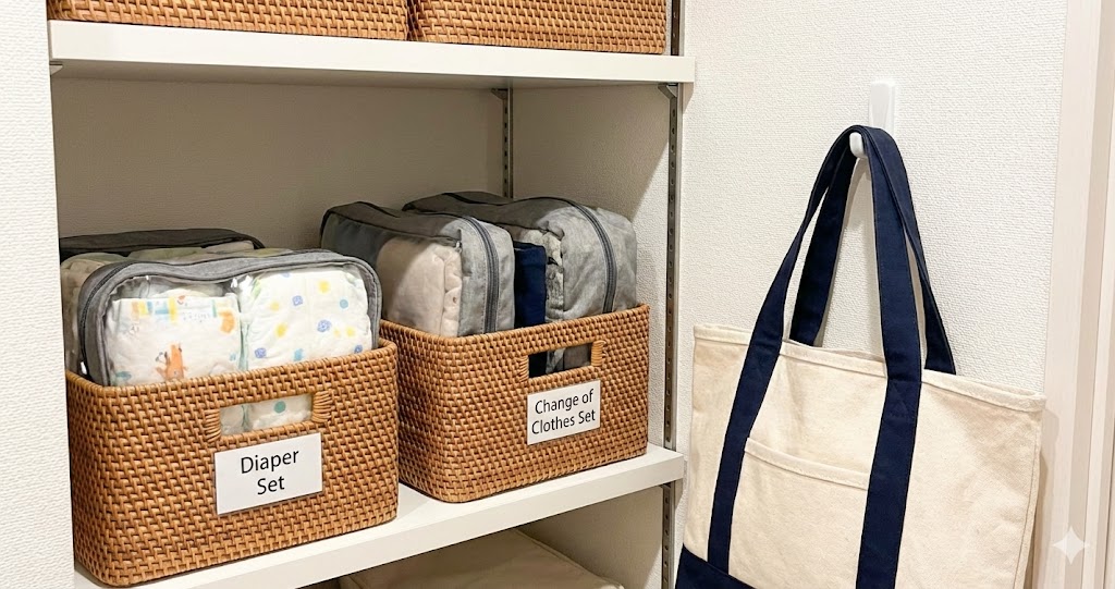子どものお出かけグッズも同様です。おむつ、おしりふき、着替え、おやつ、水筒——これらを「お出かけセット」として、専用のポーチやバッグにまとめておきます。使ったら補充して元に戻す。この習慣があれば、外出前に「おむつは足りる?」「着替えは入ってる?」と一つひとつ確認する必要がなくなります。セット化することで、準備の手間が劇的に減り、忘れ物も防げるのです。