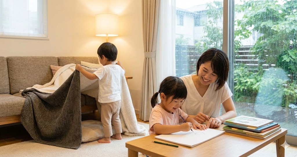 特に問題なのは、親自身も「雨の日の遊びのレパートリー」を持っていないことです。「お絵かき、折り紙、積み木——それくらいしか思いつかない」という親は多いでしょう。毎回同じ遊びでは、子どもも親も飽きてしまいます。また、親が「何か遊ばせなきゃ」とプレッシャーを感じることで、遊びが義務的になり、楽しさが失われます。親がイライラしていると、子どももその空気を感じ取り、余計に不機嫌になります。